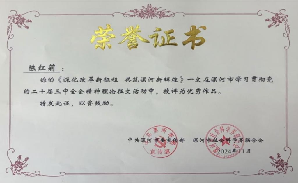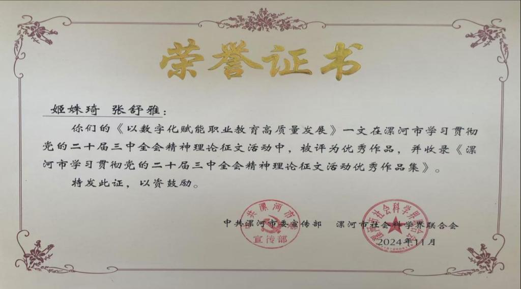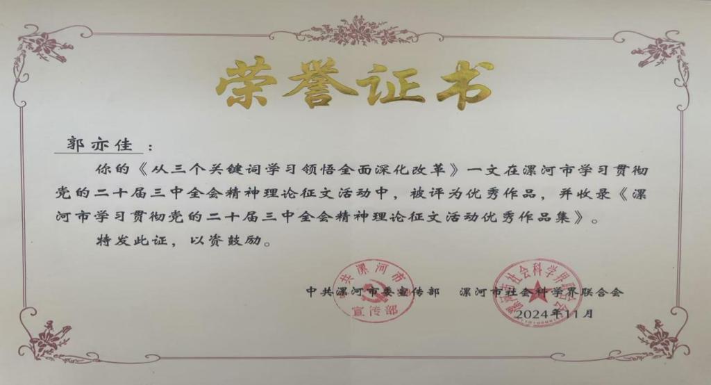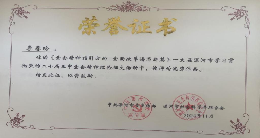 近日,漯河市举办了学习贯彻党的二十届三中全会精神理论征文活动,yl6809永利教师荣获佳绩,李春玲、郭亦佳、姬姝琦、张舒雅、王琼、陈红莉教师的文章被评为优秀作品。其中,姬姝琦受邀在全市社科理论界学习贯彻党的二十届三中全会精神研讨会上作主题发言。
