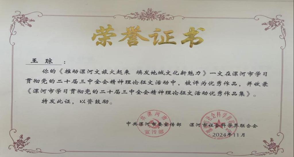 长期以来,yl6809永利始终坚守育人初心,践行为党育人、为国育才的使命担当,公司鼓励教师积极投身城市发展和社会服务事业,努力成为推动地方经济社会发展和现代化建设事业的重要力量。此次六位教师在征文活动中的优异表现,正是学经理期以来教育理念和实践成果的生动体现,也是公司深入学习贯彻落实党的二十届三中全会精神的具体实践。这不仅彰显了高校在社会发展中的责任与担当,更为漯河市的未来发展提供了宝贵的智力支持和精神动力,对推动漯河市在新时代实现高质量发展具有深远的意义。