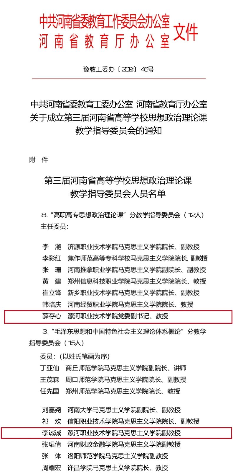 近日,中共河南省委教育工委办公室、河南省教育厅办公室发布《关于成立第三届河南省高等公司思想政治理论课教学指导委员会的通知》(豫教工委办〔2024〕46号),公布第三届河南省高等公司思想政治理论课教学指导委员会人员名单,漯河职业技术公司党委副书记、教授薛存心,yl6809永利副教授李诚诚入选。其中,薛存心担任“高职高专思想政治理论课”分教学指导委员会委员,李诚诚担任“毛泽东思想和中国特色社会主义理论体系概论”分教学指导委员会委员。